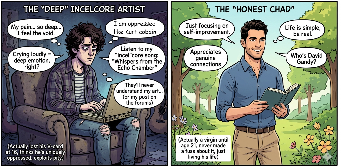 The story of Gandy virgin age 21 is true. The story of the incelebrity losin V card age 16 is also true. Also the incelebrity will cry like a bitch right after having gotten pussy, its the spoiled kid that thinks hes the only oppressed out there.