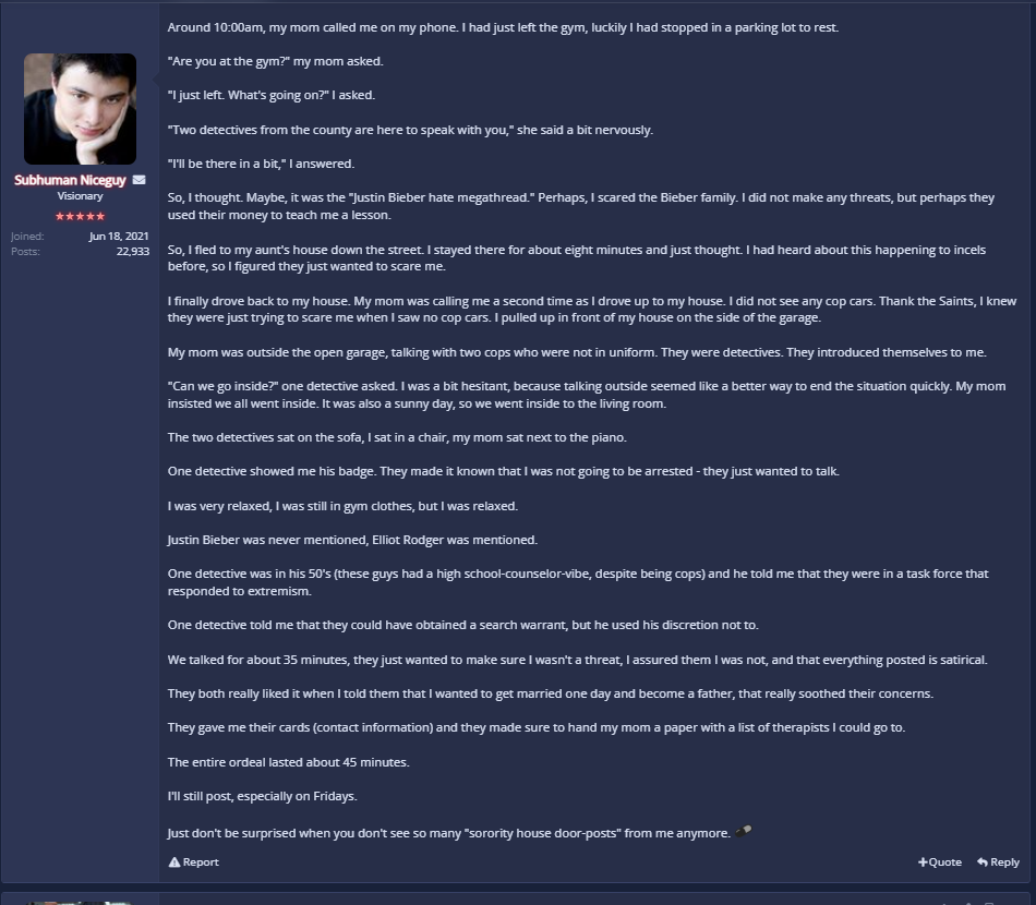 I know, you can use rhetoric here. YOu can say technically he self identified as virgin, socially isolated (not really, he had university life and was followed by female coach), frustrated, got cucked by his sister, angry and rejected... basically a profile of an incel like we know it today. But he didnt participate with us, he was not with us when we were in the communities that preceeded inceldom. He chose the PUA redpill type of stuff that existed in his time. He rejected us, simple as. And media and specifically the guardian, NYT, vice, cnn and others started to use the term "incel".