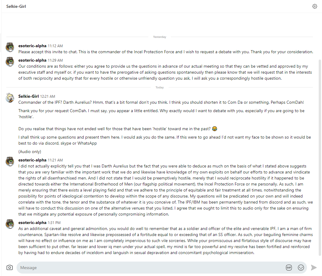I have exciting news my brothers! The premier enemy of the incel revolution and the notorious stripper/whore/hedonic stacy, "Selkie Girl" has agreed to meet me in a virtual domain of my choosing for purposes of engaging in dialectical combat wherein I shall both annihilate her paltry arguments as well as humiliate her insolent attempts to demean our noble cause. This is the opportunity we have been waiting for to finally elevate the public profile of the IBM and our forums. We need greater publicity and this clash of the titans will go down as the greatest and most notorious confrontation in the history of inceldom. I look forward to whatever suggestions or recommendation any of you comrades may have for this forthcoming confrontation. See below for the screen cap that I took of my dialogue with the whore in question thus far.