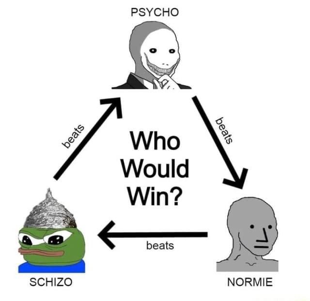 I think this meme is true. If you are a schizo you are the predator that is innately equipped to destroy the psycho. It happens im real life schizo meaning I had some hallucinations when I was younger but its all under control. Basically I was inventing reality around me.
