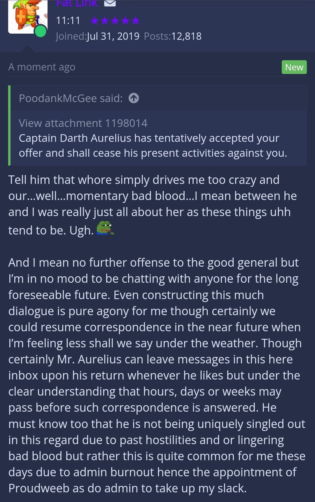 I would be the first to concede that in accordance with the rules of evidence and tests of admissibility, the proofs that I had adduced above would merely constitute circumstantial evidence but, that notwithstanding, when you have a sufficient volume of circumstantial evidence and when it all seems to confirm a particular supposition, then a reasonable inference can be made on the basis of the facts as they have been presented. I haven't' had time to make a full, slam dunk case as it were against Fat Simp as I have about a hundred other responsibilities as the commander of the IPF and leader of the incel movement. I can send you more PM screenshots that I have accumulated over time including the one I will upload below.