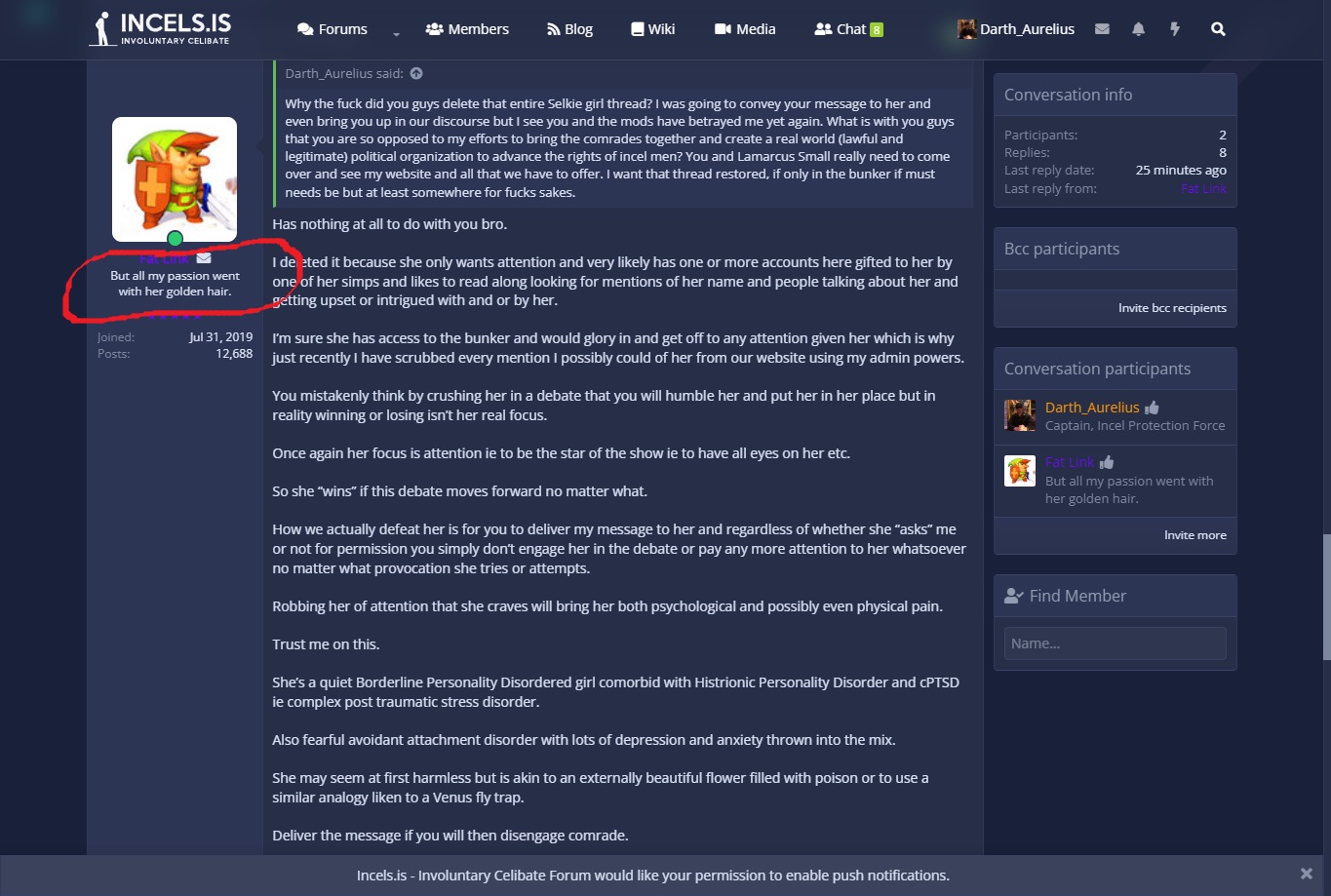 Exactly right, lieutenant. It is a fucking disgrace that those mods over there are completely beholden to one of the most invidious and dedicated enemies of the incel movement. They are her simps and will do as she commands, even granting her alt accounts that allegedly have access to such hallowed and secured places as the Bunker which, as you and I know, is reserved for only well established and veteran members of the forums. Fat Links duplicity and depravity knows no bounds and while he claims to be disgusted by her, he is obviously obsessed with her and likely jacks off to her nudes several times a day.![]()