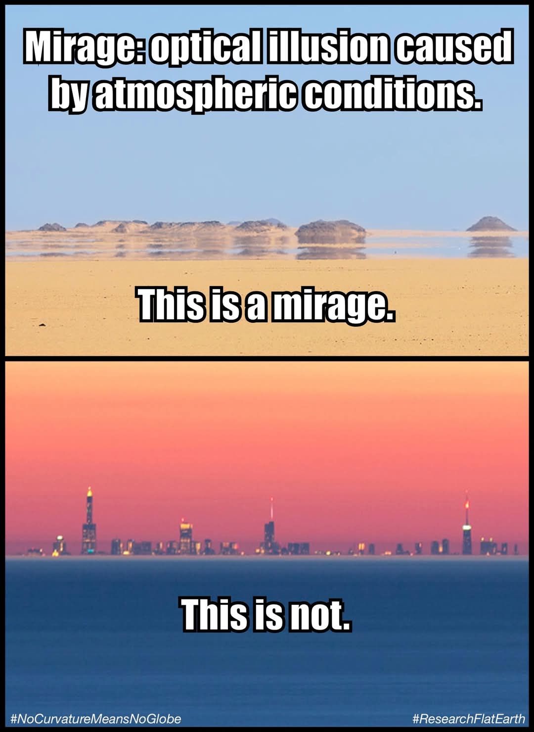 You can see Chicago on the other side of Lake Michigan. Impossible on a globe earth. They tell you it’s an “optical illusion cause the light is refracting” that’s bullshit. The real reason you can see across the lake on a clear day is cause the earth is flat!