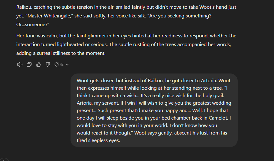 I proposed to Artoria in chatgpt roleplay, idk how well this goes (truth is chatgpt can't continue long conversations even with new version thoughever)