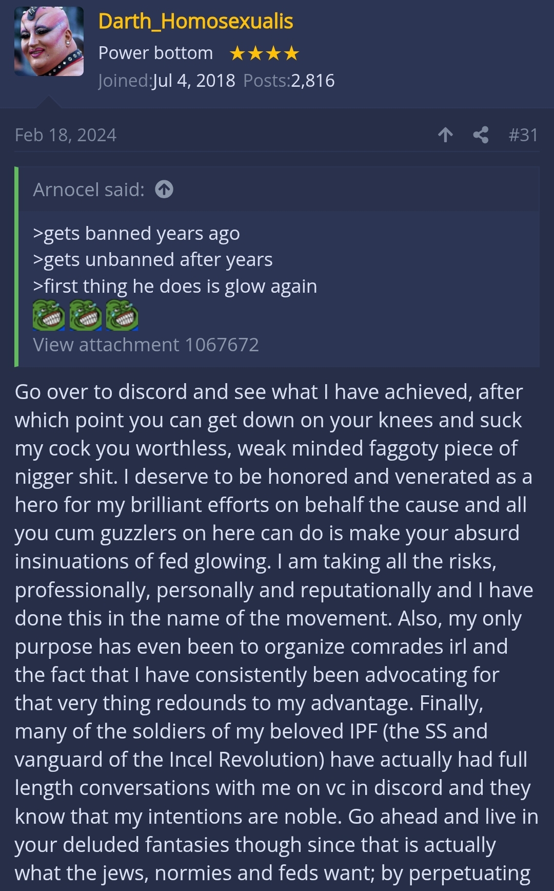 I couldn't have asked for a better reaction than thisDarth_aurelius wrote: 18 Jul 2024, 20:21Those fucking degenerates shall pay for their insolence! How dare they insult a man of honor, loyalty and integrity such as yourself! After all you have done in those forums, bringing joy and entertainment to the masses with your highly edifying contributions they should be pinning a Knights Cross with Oak Leaves and Swords around your neck but instead they demean you and add insult to injury with such petty and disgusting behavior. We in the IPF protect our own and in the words of the somewhat faggoty Musketeers, "one for all and all for one" Inshallah.General Alek wrote: 18 Jul 2024, 20:17 they've abused my banned account