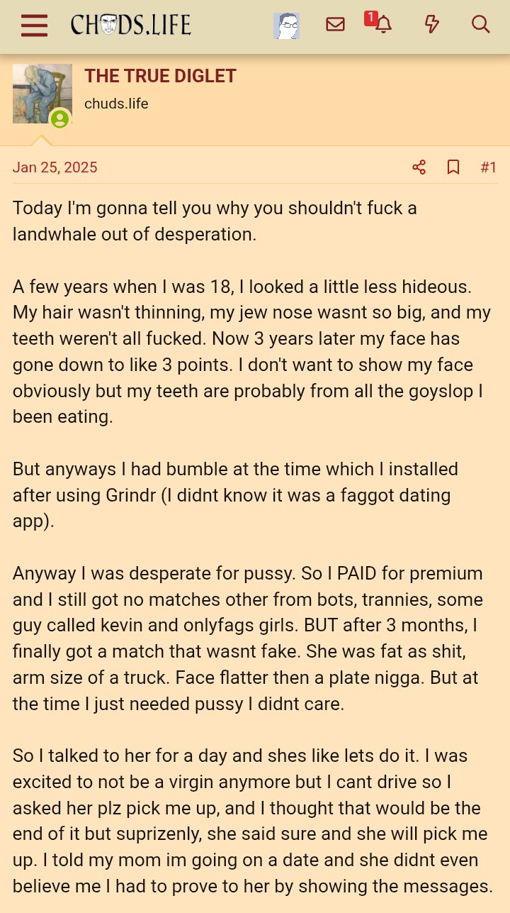 It seems to me the story has high plausibility, it can be real. I mean, even I found disgusting horrid women around or handicapped women used as cumdump by normies. Horrors like this one do exist. So I would say even if its an invented internet story at least I can praise the writer because he made it believable.
