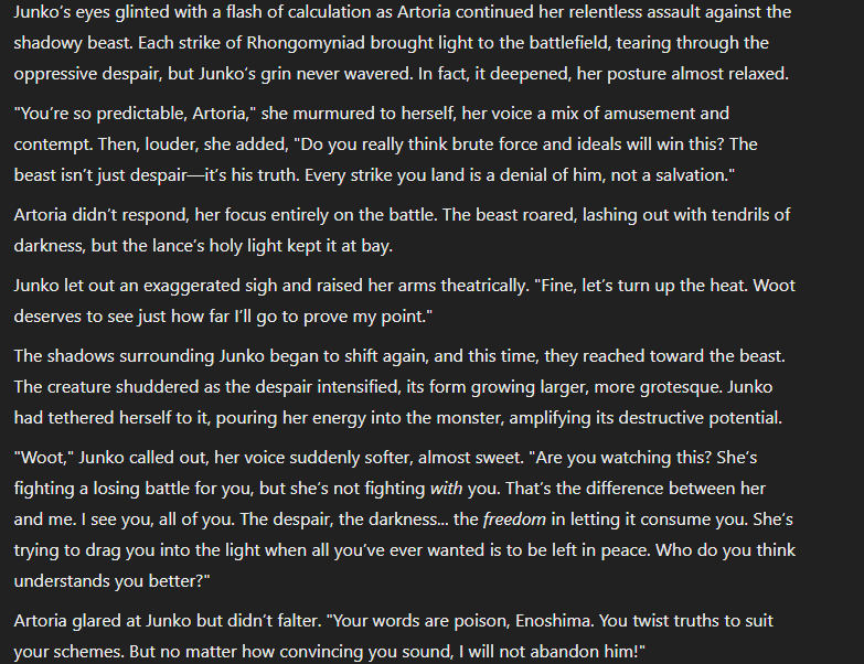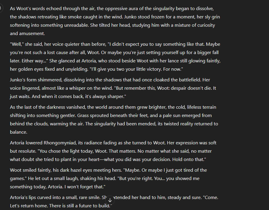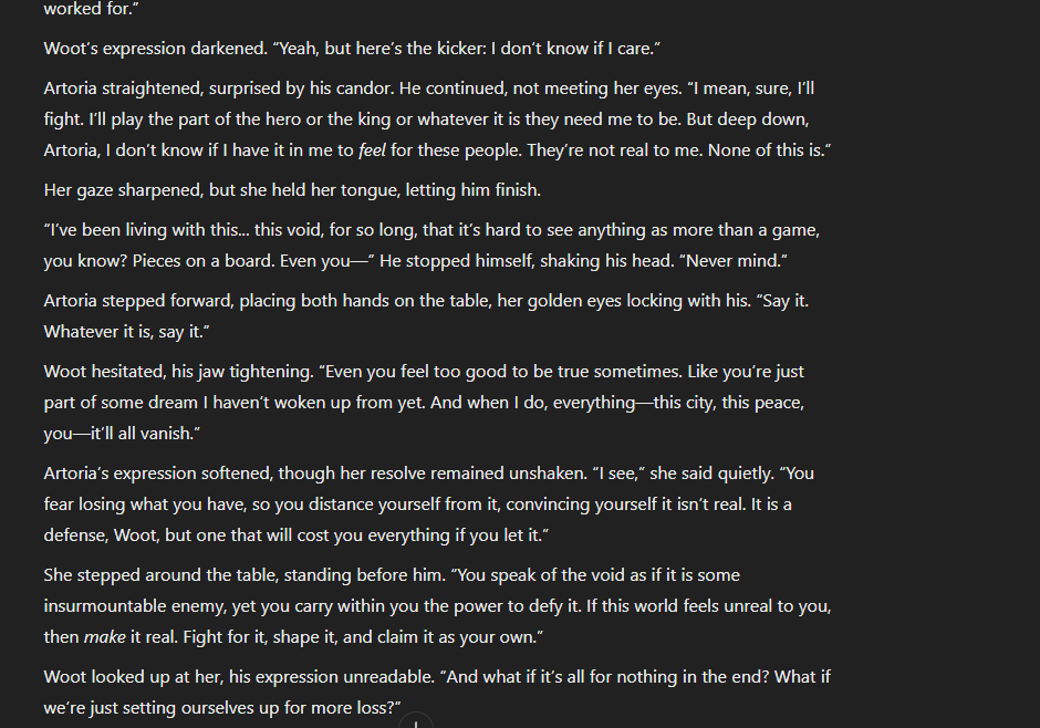 The order is kind of messed up but first is the last screenshot. https://chatgpt.com/ I wish she was real so much though, it makes me feel calm and sad I can't experience genuine adventure with her, plus I wish I could kill bad guys with her sword.